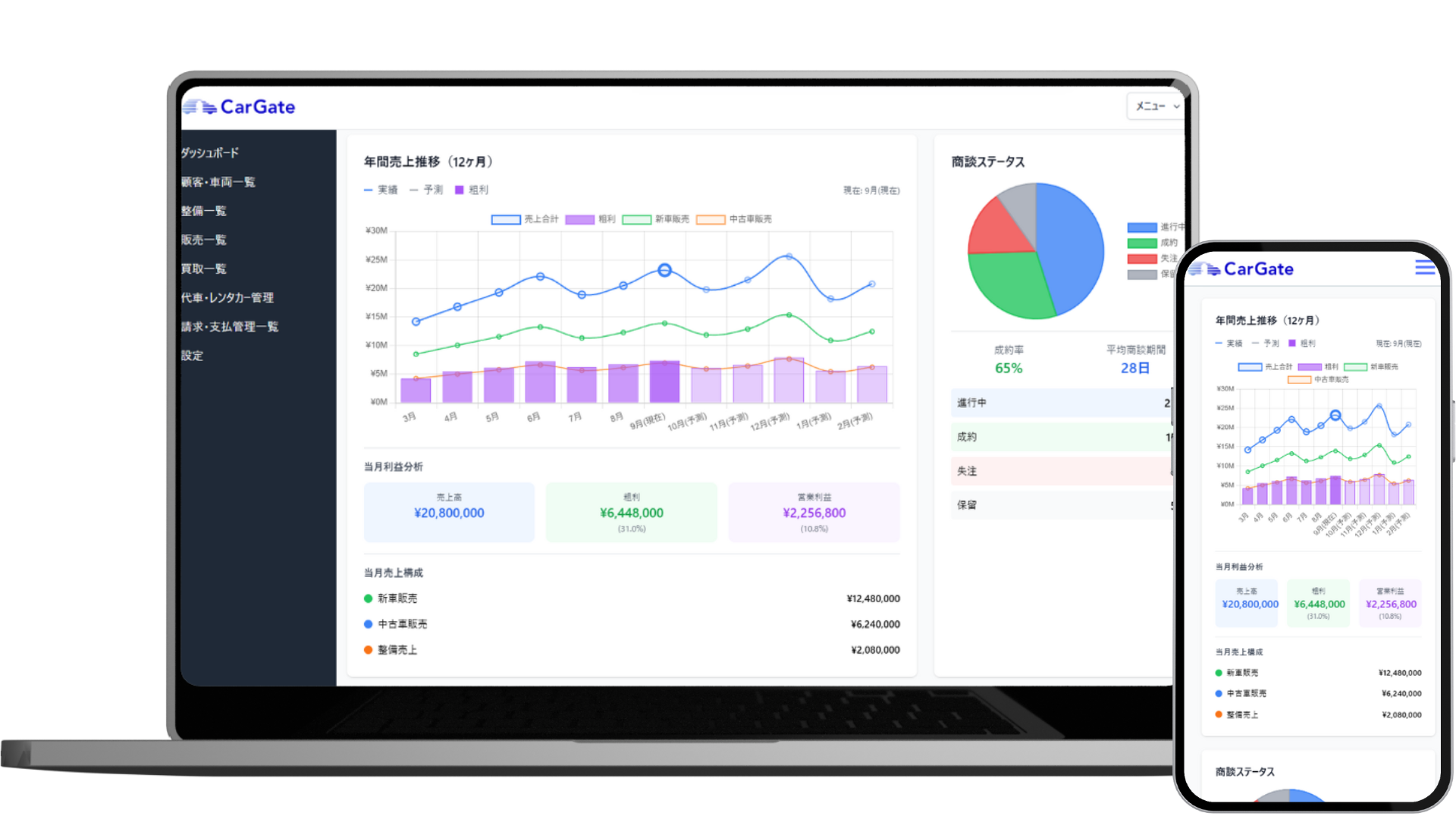当社のオールインワン経営管理ツール「CarGate」が、あなたの店舗経営を変革します。